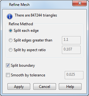 - Klicken Sie auf Netz-Werkzeuge-Registerkarte > Dreiecke-Gruppe > Verfeinern, um das Dialogfeld Netz verfeinern anzuzeigen. Die Anzahl an Dreiecken in der Auswahl oder in dem gesamten Netz wird angezeigt. Sie können die Auswahl ändern, solange der Dialog geöffnet ist. Verwenden Sie dieses Dialogfeld, um festzulegen, welches Verfahren verwendet werden soll, um die Dreiecke des Netzes zu verfeinern: