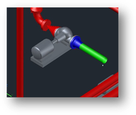 Arbeiten mit XRefs konzipiert. Rohre und Rohrleitungskomponenten werden mit Rohren und Rohrleitungskomponenten und sogar Apparatestutzen in XRef-Modellen verbunden. Beispiel: Wenn Sie mit dem Befehl Leitungsverlauf erstellen arbeiten und auf den Apparatestutzen in der XRef klicken, wird die Verbindung hergestellt und die richtigen Komponenten werden platziert, wie hier gezeigt: