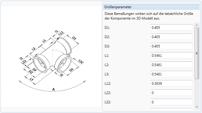 Für jede Geometriezuordnung ist außerdem ein entsprechender Satz an Parametern vorhanden, die sich je nach Form unterscheiden können. Das folgende Bild stellt ein Plant 3D-T-Stück mit Innengewinde im Katalog-Editor (Registerkarte Größe) mit seinen Parametern dar.