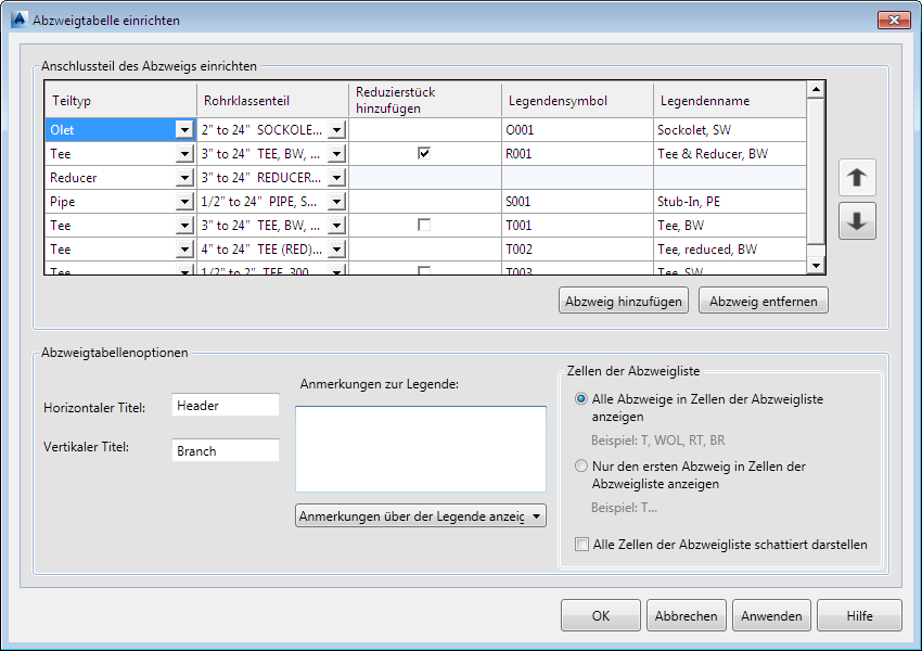 Ermöglicht das Definieren der in der Abzweigtabelle verwendeten Fittings. Sie können auch Anzeigeoptionen für die Abzweigtabelle festlegen.