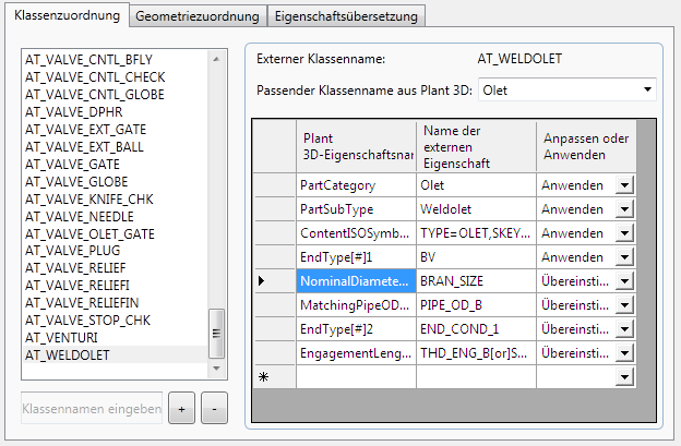 Globale Eigenschaften wie Langbezeichnung, Druckstufe, Wandstärkenreihe usw. können einmal für alle Klassen zugeordnet werden. Dagegen werden individuelle Klasseneigenschaften eins-zu-eins entsprechenden Plant 3D-Klasseneigenschaften zugeordnet.