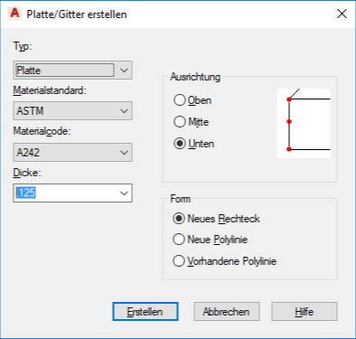 Gibt das Profil der Platte oder des Gitters an. Die Optionen lauten Neues Rechteck, Neue Polylinie und Vorhandene Polylinie.