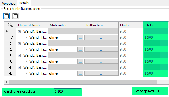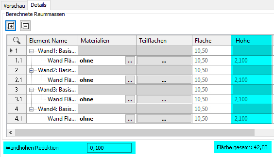 (Raummengen berechnen), um das Dialogfeld Raummengen berechnen zu öffnen. Wählen Sie eine Wandfläche aus der Baumstruktur aus, und navigieren Sie unten im Dialogfeld zu Wandhöhenreduktion.