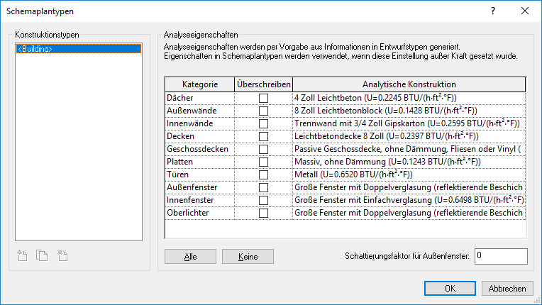 Bei der nächsten Energieanalyse werden die thermischen Eigenschaften der angegebenen Schemaplantypen (analytischen Konstruktionen) für die betreffenden Elementkategorien verwendet.
