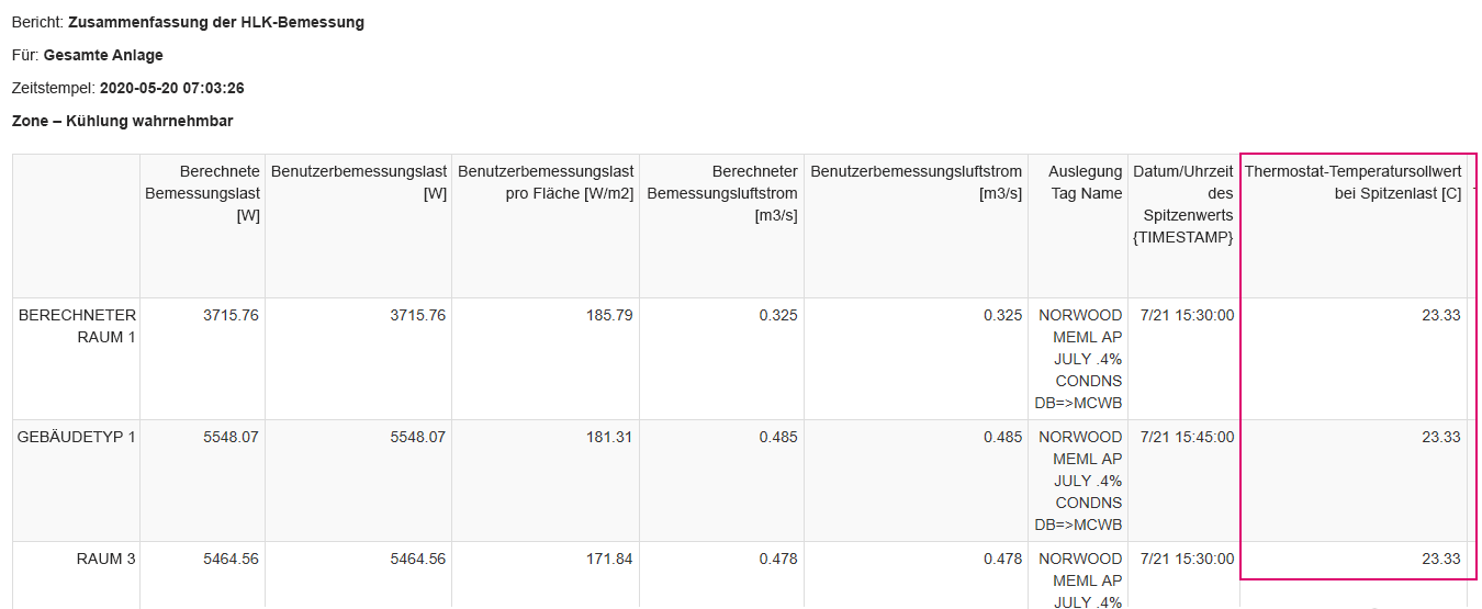 Diese Sollwerte werden bei der Durchführung einer Systemanalyse verwendet. Nach dem Ausführen einer Bemessungsanalyse werden die Sollwerte für Kühlung und Heizung in der Zusammenfassung für die Bemessung von Heizung, Lüftung und Klimatisierung des Analyseberichts angezeigt.