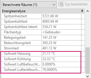 Nachdem Sie das Energiemodell erstellt haben, werden die Sollwerte in den Einstellungen für den Gebäudetyp auf die berechneten Räume angewendet und in der Eigenschaftenpalette als schreibgeschützt angezeigt.