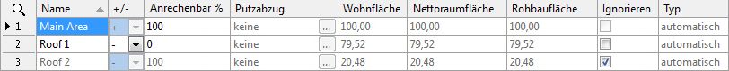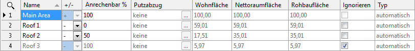 - Dach 1: Zeigt Teilflächendaten für die Fläche unterhalb der Höhenlinie bei 1,00 m an. Die Fläche wird von der Hauptfläche subtrahiert (Berechnungsfaktor 0 %).