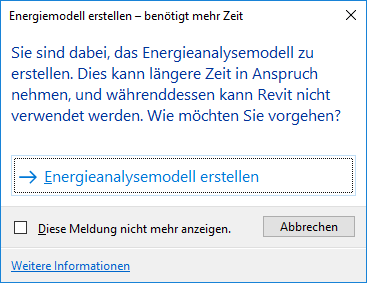 Durch dieses Dialogfeld wird ein versehentliches Auslösen des Vorgangs zur Erstellung des Energiemodells vermieden. Um diese Meldung in Zukunft zu überspringen, aktivieren Sie das Kontrollkästchen.