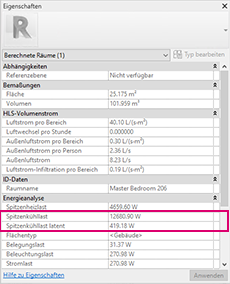 Zusätzlich zu dem Bericht, der nach einer Analyse generiert wird, werden der Spitzenbedarf für Heizung, Kühlung und Luftstrom ebenfalls als Eigenschaften für jeden berechneten Raum festgelegt. Das folgende Beispiel zeigt die gleiche Kühllast wie im obigen Berichtsabschnitt hervorgehoben.