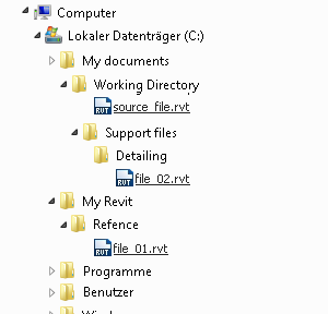 Daraufhin sind alle ursprünglichen absoluten Pfade nicht aufgelöst, da sie auf einen bestimmten Speicherort verweisen. Der relative Pfad zu file_01.rvt ist ebenfalls unterbrochen, da sich die Datei nicht innerhalb des Arbeitsverzeichnises befunden hat und darum nicht mit dem Arbeitsverzeichnis verschoben wurde.