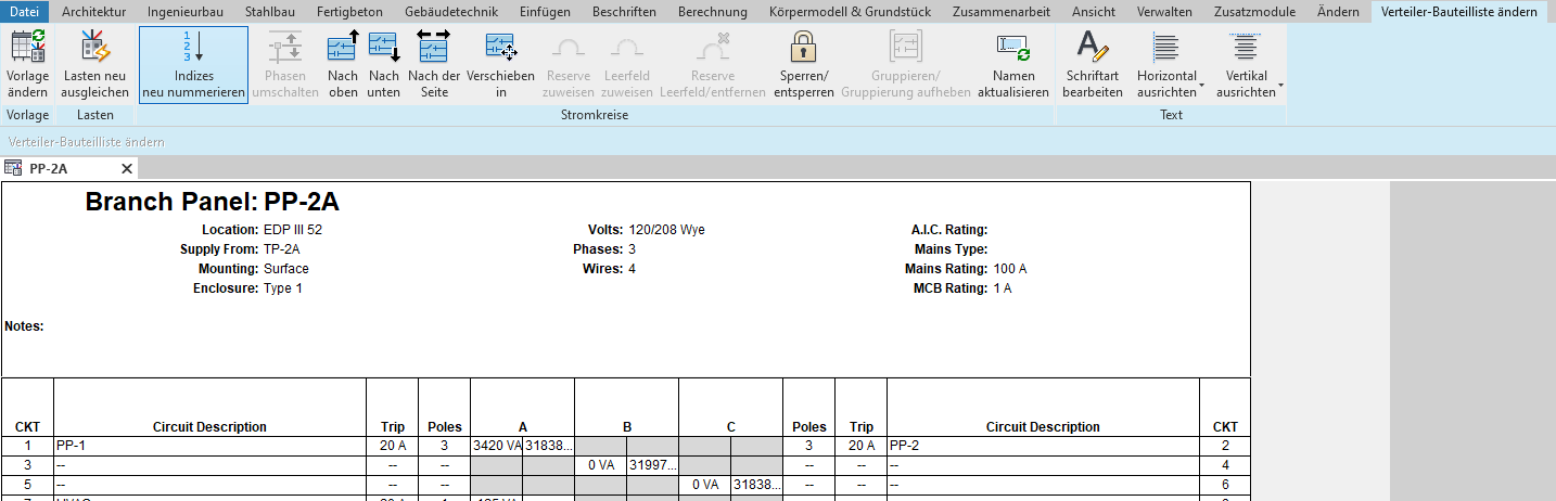 Wenn eine Verteiler-Bauteilliste angezeigt wird, können Sie Stromkreise auf der Schalttafel neu anordnen, indem Sie sie nach oben, unten, links und rechts verschieben oder indem Sie sie gruppieren und an ihren Positionen sperren. Sie können auch die Last über die Phasen hinweg ausgleichen, Reserveklemmen und Leerfelder zuweisen und Stromkreisnamen aktualisieren.