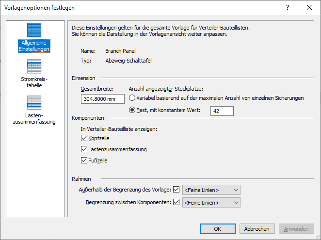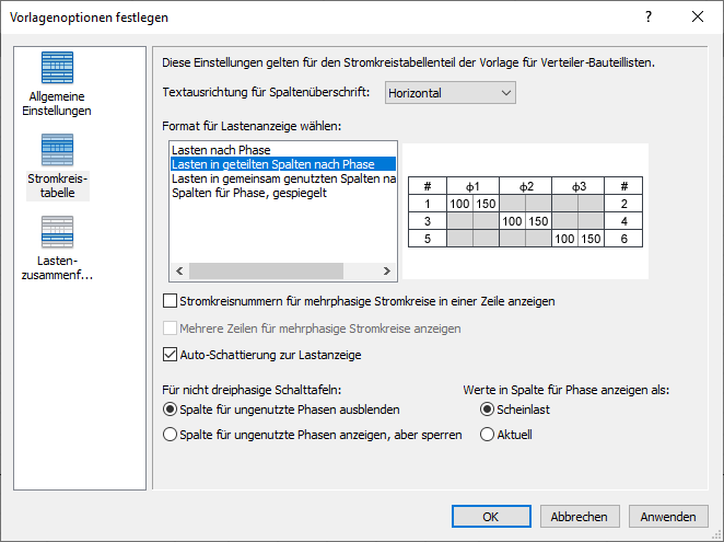 Legt das Layout der Stromkreisinformationen für die Verteiler-Bauteilliste und Einstellungen bezüglich des Stromkreises fest.