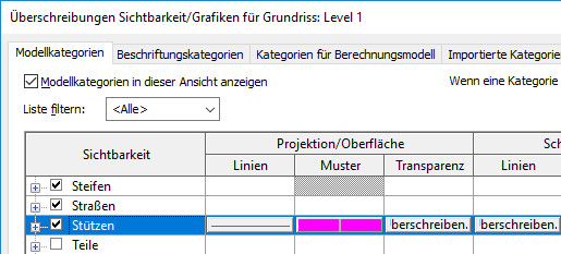 In der folgenden Abbildung sind in der Kategorie Stützen Überschreibungen für Projektion/Oberflächenlinien und Muster vorhanden.