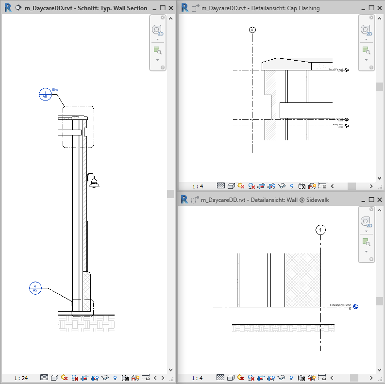 Sie können Detailausschnitte zu Draufsichten, Schnittansichten, Detailansichten oder Ansichten hinzufügen. In diesen Ansichten ist die Detailausschnittsbeschriftung mit der Detailausschnittsansicht verknüpft. Die Detailausschnittsansicht zeigt eine vergrößerte Version eines Teils der übergeordneten Ansicht und liefert zu diesem Teil des Gebäudemodells weitergehende Informationen.