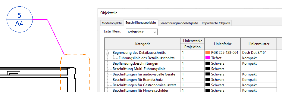 Sie können Linienstärke, Farbe und das Muster von Detailausschnittsbeschriftungsblöcken und Führungslinien ändern. Die hier angegebenen Einstellungen gelten für alle Detailausschnitte des Projekts.