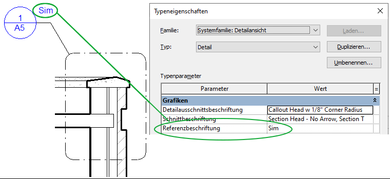 Standardmäßig enthält die Detailausschnittsbeschriftung eines Referenzdetailausschnitts eine Beschriftung wie z. B. Ähnl., eine Abkürzung von Ähnlich). Diese Beschriftung können Sie je nach Projekterfordernis bzw. Unternehmensvorgabe ändern. Sie können z. B. Spiegeln oder Umkehren als Referenzbeschriftung verwenden.