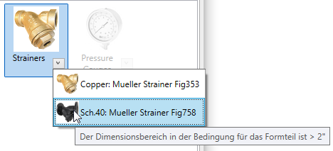 Wenn Sie auf den Pfeil klicken, wird eine Dropdown-Liste mit zusätzlichen Teilen, basierend auf der Dimension, angezeigt. Diese Dropdown-Liste wird ähnlich wie bei Routing-Voreinstellungen durch die in der Definition der Kategorie festgelegten Bedingungen gesteuert. Beispielsweise kann für eine Biegung bis zu einer bestimmten Dimension ein gepresster, für größere Dimensionen dagegen ein Segmentbogen verwendet werden. Wenn Sie den Mauszeiger über ein Teil in der Liste bewegen, wird eine QuickInfo angezeigt, in der der Dimensionsbereich gemäß der Bedingung für das Teil angegeben wird.