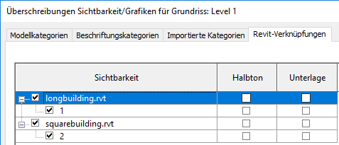 Für die Sichtbarkeit und Grafiken verknüpfter Revit-Modelle steht im Dialogfeld Sichtbarkeit/Grafiken eine eigene Registerkarte (Revit-Verknüpfungen) mit entsprechenden Parametern zur Verfügung.