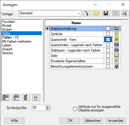 Wählen Sie im Dialogfeld Anzeige aus der Liste der Objekte die Option Stäbe aus, und wählen Sie dann, wie unten gezeigt, Querschnitt –·Form aus der Liste der Attribute aus.