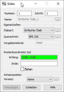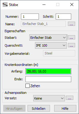 Im Dialogfeld Stäbe ist der Vorgabe-Stabtyp auf Einfacher Stab und der Querschnitt auf IPE 100 eingestellt, wie unten gezeigt. Für diese Übung müssen Sie zwei weitere Querschnitte hinzufügen.
