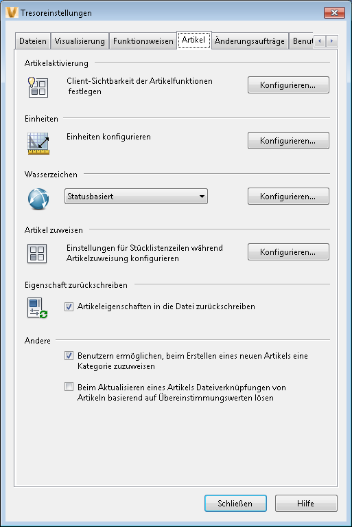 Die Registerkarte Artikel im Dialogfeld Tresoreinstellungen enthält Optionen zum Konfigurieren von Maßeinheiten, Verwalten von Voreinstellungen für Wasserzeichen, Konfigurieren von Einstellungen für Stücklistenpositionen und Aktivieren des Zurückschreibens von Artikeleigenschaften in verknüpfte Dateien. Sie können die Artikelfunktion auch deaktivieren.