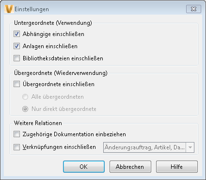 Geben Sie an, ob nur die untergeordneten Dateien, nur die übergeordneten Dateien oder alle verbundenen Dateien der Datei in den Tresorvorgang einbezogen werden sollen. Benutzer von Vault Professional können auch entscheiden, ob verknüpfte Objekte eingeschlossen werden sollen.