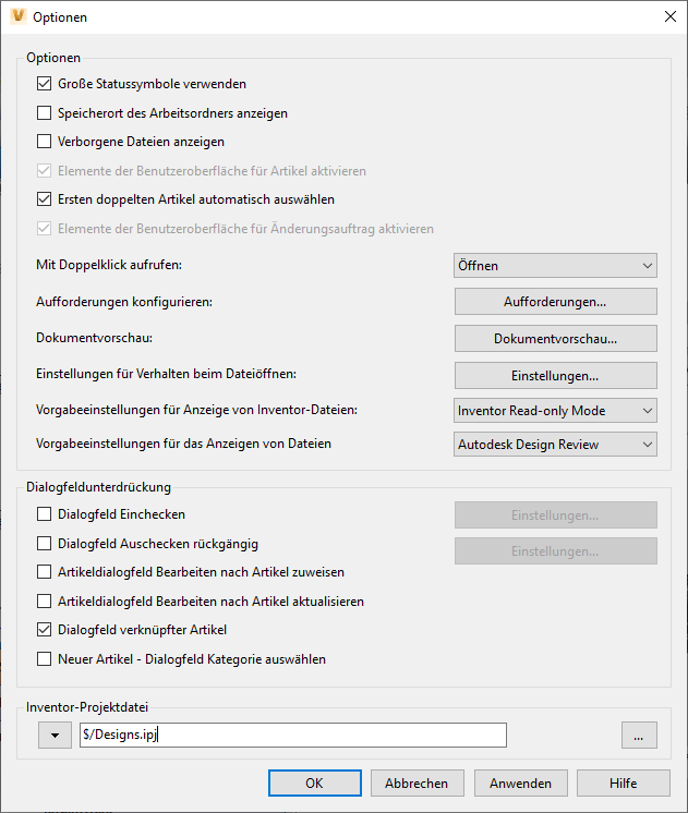 - Vorgabeeinstellungen für Anzeige von Inventor-Dateien