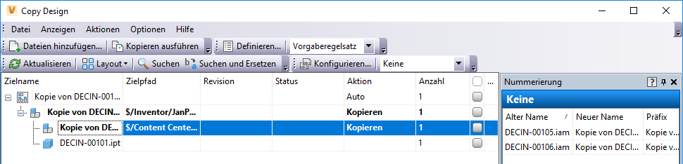 Wenn beispielsweise eine Datei zum Kopieren und die verknüpfte Zeichnungsdatei als Auto markiert ist, erhält die Zeichnung nach Abschluss des Kopiervorgangs automatisch denselben neuen Dateinamen und Speicherort wie die verknüpfte Datei.
