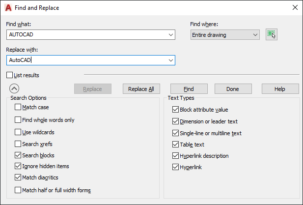 The Find Where setting controls whether to find and replace text in the entire drawing or text in the currently selected object or objects.