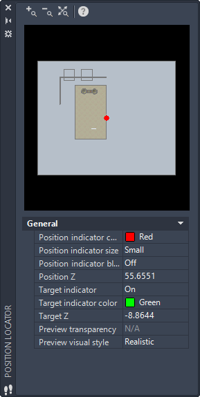 By default, this window is automatically displayed during a 3d walk-through or fly-through. Change the settings or drag the indicators in this window to reposition the in the viewpoint in the drawing area.