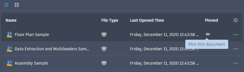 Pinning a file keeps it displayed at the top of the list until you unpin it.