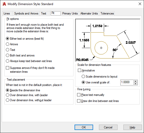 Controls the placement of text and arrowheads based on the space available between the extension lines.