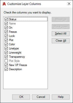 Sets which columns are displayed in the Layer Properties Manager for the current Model tab or layout tab.