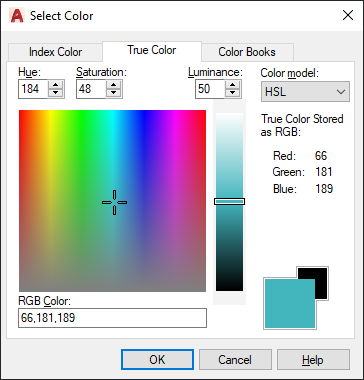 Specifies the RGB color model for selecting colors. The options available on the True Color tab are dependent on whether the HSL or RGB color model is specified.