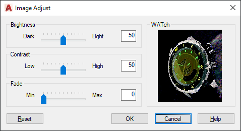 Controls the fading effect of the image. The greater the value, the more the image blends with the current background color. A value of 100 blends the image completely into the background. Changing the screen background color causes the image to fade to the new color. In plotting, the background color for fade is white.