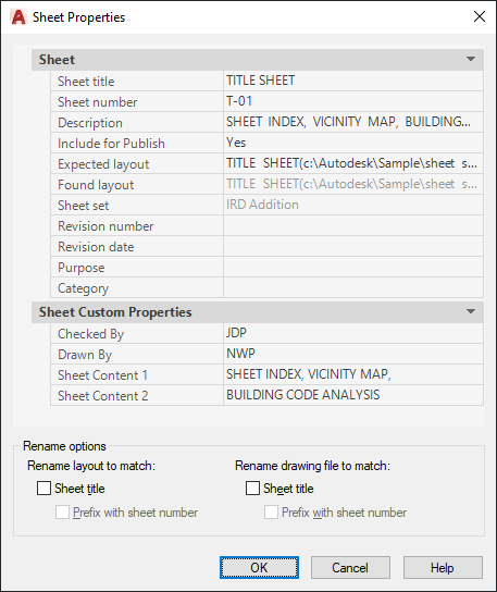Displays information that is specific to the selected sheet, such as the sheet title, sheet number, and whether it will be included in publishing operations. Also displays custom properties, if any.