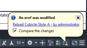 By default, if a referenced file has changed, a balloon message is displayed near the Xref icon in the lower-right corner of the application window (the status bar tray). Click the link in the balloon to reload all changed xrefs.