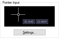 When pointer (cursor) input is on and a command is in progress, the coordinate location of the crosshairs is displayed in tooltip entry boxes near the cursor. You can enter coordinates in the tooltip instead of on the command line.