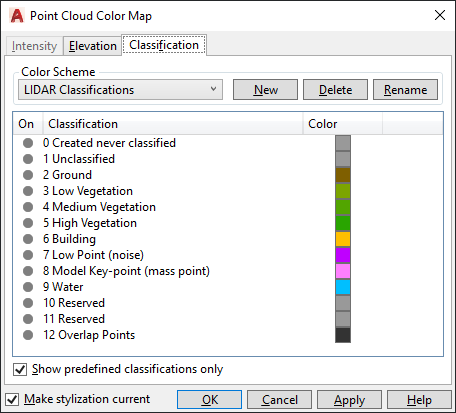 Edits the color scheme settings for Classification point cloud stylization.