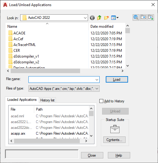 If you select a file that is already loaded, Load reloads the application when applicable. You cannot reload ObjectARX applications. In this case, you must first unload the ObjectARX application and then load it again. The Load option is also available from a shortcut menu by right-clicking a file on the History List tab.