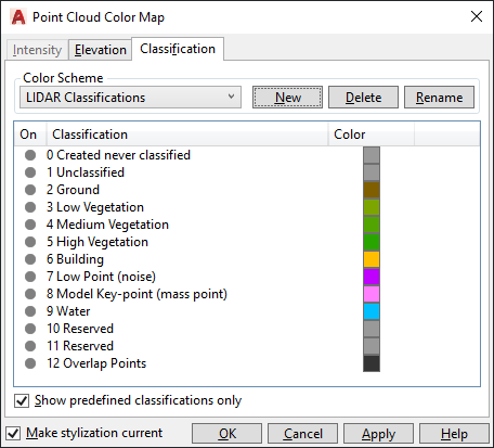 Colorization for the intensity, elevation, and classification stylizations is based upon the color scheme you assign. You can assign a different color scheme to each stylization.