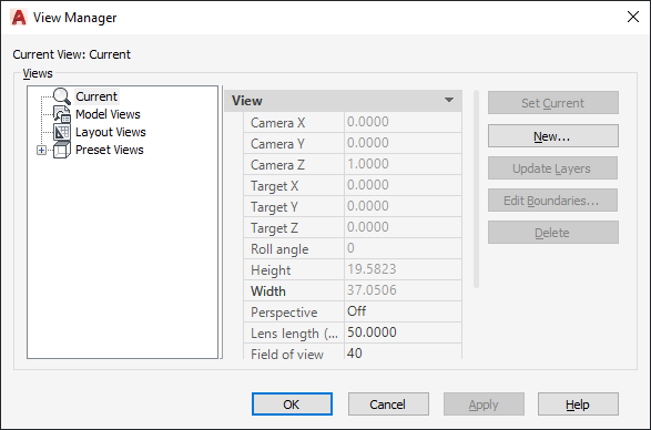 • Layout Views. Displays a list of viewports on a layout that define a view, and lists General and View properties for a selected view.