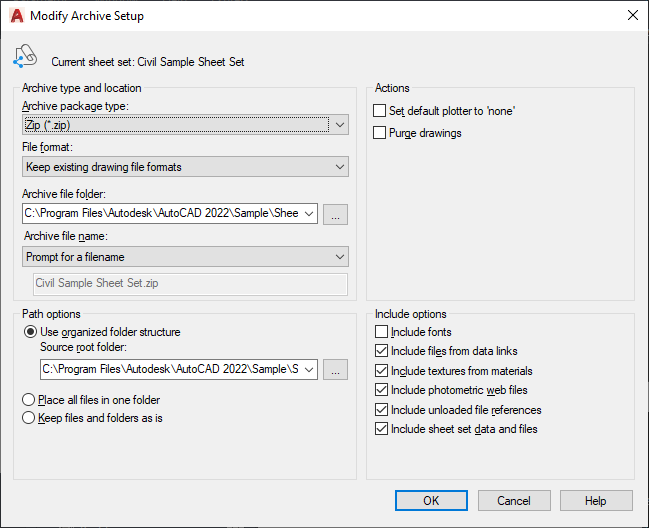 Includes the sheet set data (DST) file, label block drawing files, callout block drawing files, and drawing template (DWT) files with the archive package.