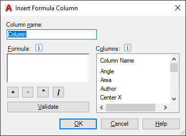 Displays the column names from the extracted drawing data and external data (if data linking was established). Column names can be double-clicked to be added to the Formula field or dragged from the Column list to the Formula field. Existing formula columns are not listed and cannot be used as values for creating additional formula columns.