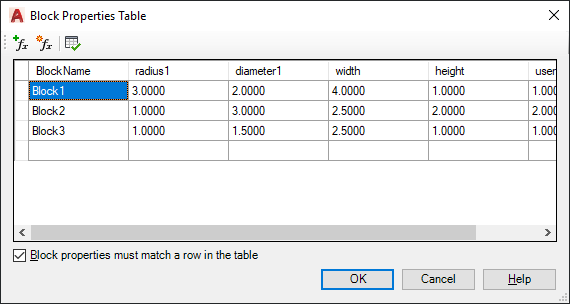 In the Block Properties Table dialog box, the column headings are parameters and the rows define the property set values. A selected block reference can be set to the defined values. Each block definition can have one table.
