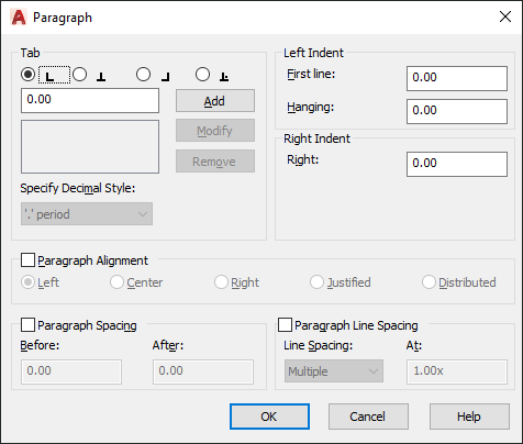 MTEXT (Command) Find: Right-click the selected text > Paragraph