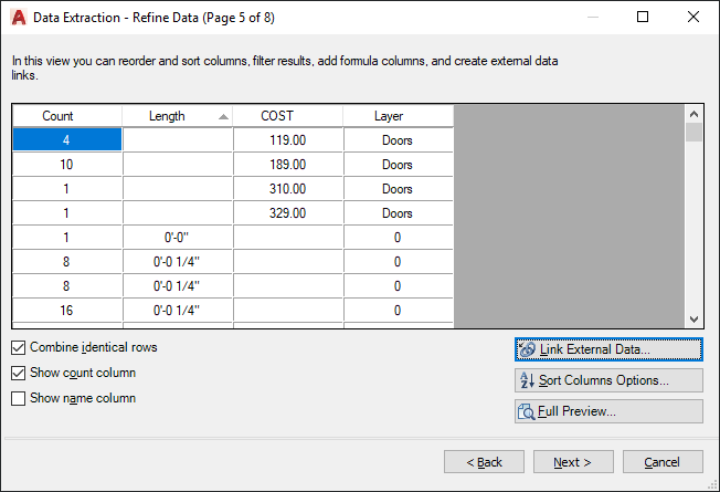 After you select the properties of the doors, the extracted data is displayed in the wizard in columns. You can organize and refine the information in these columns, and format it by specifying a table style or using an existing table as a template.