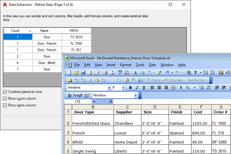 Information stored in an Excel spreadsheet can be linked and combined with the extracted drawing data (object property data). Continuing with the example above; you have some additional information about the doors in the your drawing in an Excel spreadsheet (supplier and cost). You select the columns for supplier and cost in the spreadsheet and combine them with the other data in the data extraction.