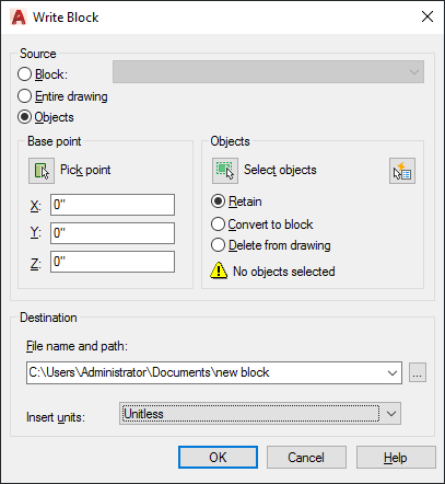 The Write Block dialog box provides a convenient method for saving part of the current drawing to a different drawing file, or saving a specified block definition as a separate drawing file.