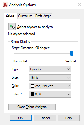 The tabs in the dialog box contain settings for adjusting each of three types of solid and surface analysis: zebra (continuity), curvature, and draft angle.